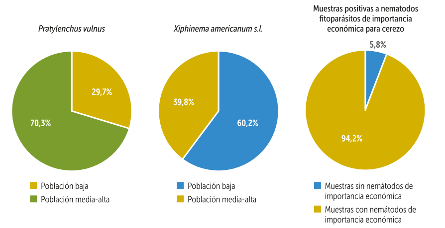 Cabe destacar que todos los portainjertos de cerezos actualmente utilizados en Chile son susceptibles a estos géneros de nematodos, lo que agrava el impacto productivo. Más del 70% de las muestras presentaron Pratylenchus vulnus, con poblaciones medias-altas entre 70 y 4.760 individuos por 250 cm³.