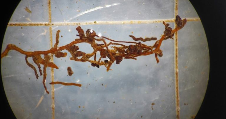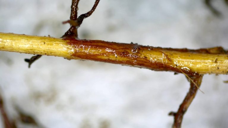 Los nematodos del género Pratylenchus son endoparásitos migratorios (viven dentro y fuera de la raíz) se movilizan y alimentan del tejido cortical del sistema radicular, destruyendo las células a su paso causando necrosis (Foto 1) y reducción del vigor.
