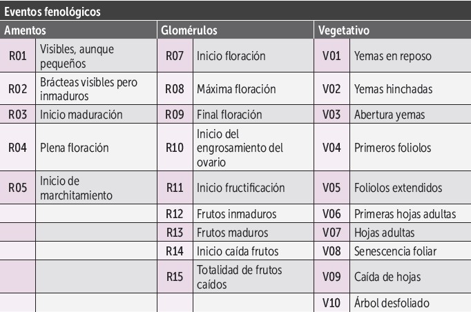 Para este seguimiento, se utilizó la escala fenológica italiana (GFI system: Giardini Fenologici Italiani) de Malossini (1993), utilizada por la industria, y cotejada con la escala con código BBCH (Biologische Bundesanstalt, Bundessortenamt und Chemische Industrie) propuesto para esta especie (Taghavi et al., 2022) (Cuadro 1). De acuerdo con estos criterios, las plantas fueron identificadas y rotuladas debidamente para realizar el seguimiento semanal. En el caso de los amentos se siguieron cinco eventos fenológicos: R01-R05, mientras que en los glomérulos (flores femeninas) los estados fenológicos monitoreados fueron nueve: R07-R15 (Tabla 1).
