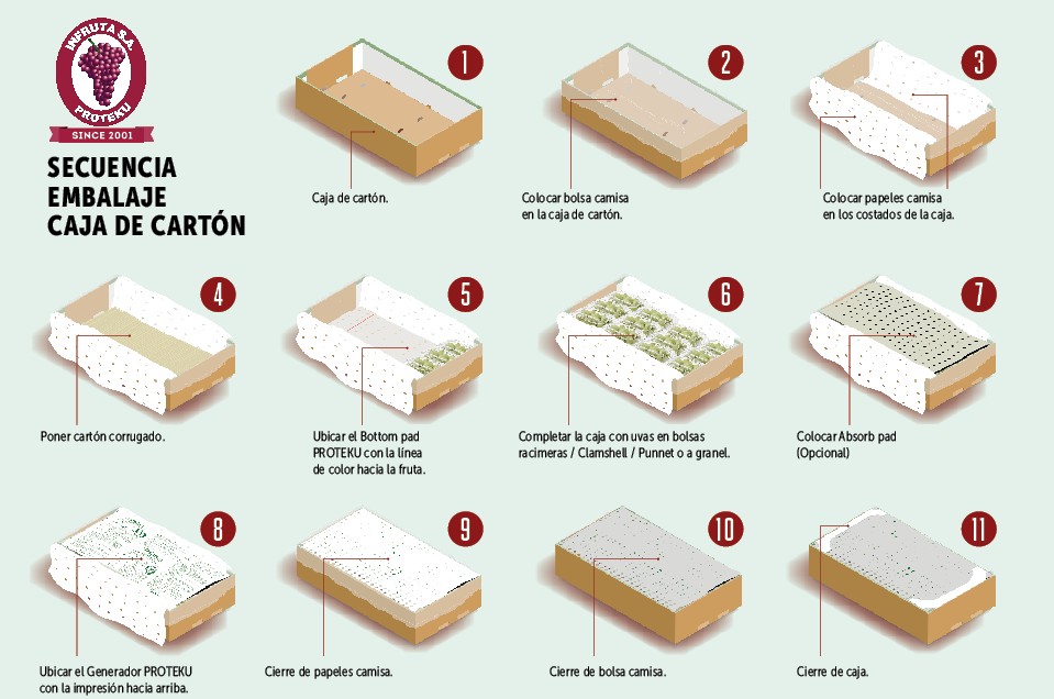 También es importante el tamaño del generador a usar en los diferentes embalajes. Para fruta que entre cosecha y llegada a destino enfrenten periodos superiores a 3 semanas o uvas cosechadas durante climas adversos, sea por lluvia o neblina, es fundamental -además- del uso de bottom SO2 pads al fondo de la caja, utilizar generadores de superficie (parte superior de la caja) que cubran al menos un 75% del área interna de la caja, de manera de lograr que el SO2 cubra todos los costados y esquinas, lugares donde generalmente se desarrolla la pudrición, para posteriormente propagarse al resto de los racimos.