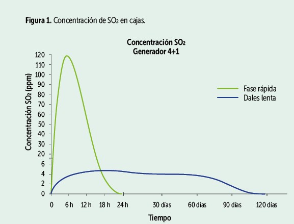 En el uso de generadores de SO2 el funcionamiento depende de la cantidad del ingrediente activo (metabisulfito de sodio), de las barreras de humedad (polipropileno, polietileno y poliéster) y de la ventilación de las cajas y bolsas camisa.
