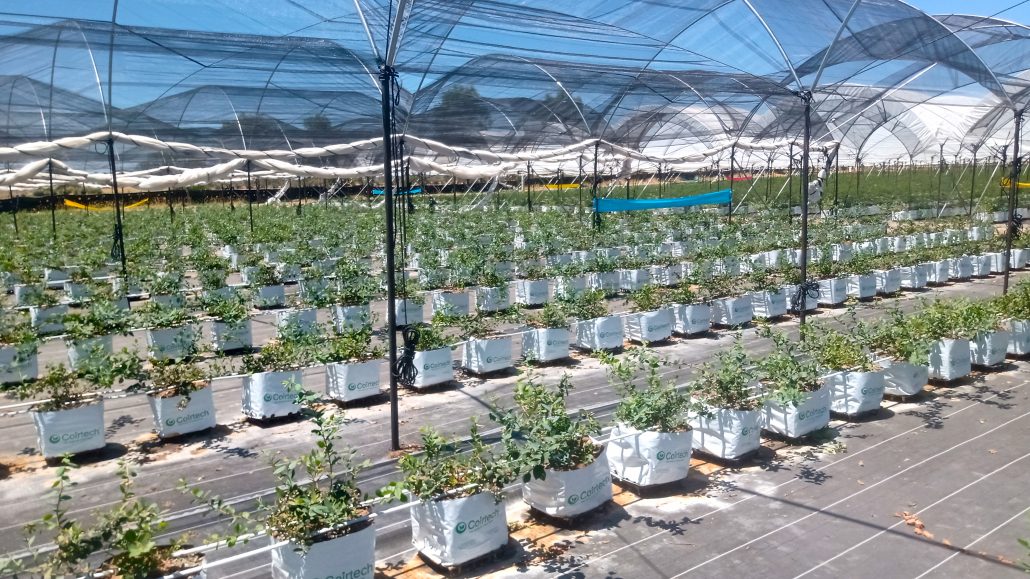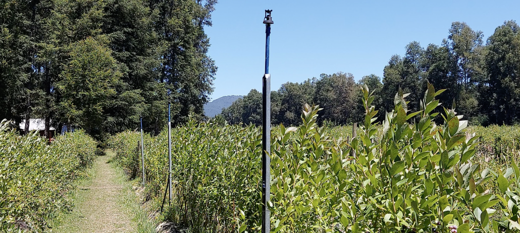 No se entiende un huerto de arándanos, ya sea establecido en suelo o en contenedores, sin riego tecnificado. El agua y el aire son necesarios para el crecimiento de las plantas y las raíces, sin embargo, a medida que aumenta el contenido de agua, puede disminuir la disponibilidad de oxígeno en el suelo. Debido a esto, en suelos de baja macroporosidad, se hace necesaria optimizar la relación agua – aire en el suelo, ya que un inadecuado manejo del riego puede disminuir el oxígeno en la rizosfera, sobre todos en suelo con pocos macroporos. Para que el arándano tenga un adecuado desarrollo y crecimiento de la parte aérea y raíces, es necesario evitar que las plantas estén sometidas a falta de agua o de oxígeno. La idea, que si bien parece sencilla, es compleja de implementar. Ello porque cada vez que se riega, se aumenta el contenido de agua y se disminuye la aireación en forma importante. Esto es algo que nos obliga a ser muy precisos en la aplicación del agua de riego, para así evitar déficit o exceso de humedad especialmente en suelos pesados. En general, las imprecisiones en el manejo de riego se deben a tres causas: la primera, es que los equipos están mal sectorizados; la segunda, que estos están descalibrados y la mantención es deficiente (por ello entregan caudales variables y diferentes a lo proyectado) y la tercera, se debería a errores en la aplicación del agua de riego, especialmente en suelos con limitantes de aireación o retención de humedad. Por lo indicado anteriormente es necesario preocuparse de los siguientes factores: Sectorización de los equipos de riego: En la mayoría de los equipos de riego se encuentran sectores de riego (superficie que se maneja a partir de un mismo mando), con diferentes tipos de suelo (textura, profundidad, pendiente Y exposición, entre otros). Esto dificulta la optimización de la relación agua-aire en el suelo ya que, mientras se está favoreciendo una parte del sector de riego, se está perjudicando otra. Por ello, la sectorización de los equipos de riego es de vital importancia, sobre todo en suelo de textura fina (franco arcillosos a arcillosos), donde hay que ser muy preciso con el manejo del riego para mantener el suelo en buenas condiciones de humedad y aireación. Uniformidad de descarga de los emisores: Es fundamental considerarlo para que así todas las plantas reciban la misma cantidad de agua y fertilizantes. Para conseguirlo, es necesario tener en cuenta dos aspectos: evitar sobre todo en plantaciones en pendiente, que los sectores más bajos reciban mayor cantidad de agua que los sectores altos, ya que es en estos lugares (sectores bajos) es donde se descarga el agua que está en las tuberías cuando los equipos han dejado de funcionar. Esto toma mayor importancia cuando se utiliza riego de alta frecuencia (pulso), donde el equipo tiene varias partidas y detenciones durante el día, problema que se puede minimizar utilizando emisores antidrenaje y diseñar con subsectores pequeños. El segundo aspecto es la calibración y mantención en forma periódica de los equipos de riego, de manera que todos los emisores entreguen caudales similares. Selección del método de riego (volumen de suelo mojado): Una serie de estudios y trabajos han considerado que, para aplicar el agua, los métodos de riego por microaspersión y goteo son los que mejor se adaptan a las plantaciones de arándano. Respecto al riego por aspersión, no se recomienda su utilización por sobre la canopia, excepto para control de heladas (Foto 1), ya que al mojar el follaje puede aumentar la incidencia de enfermedades. Al momento de elegir un equipo de riego localizado, es muy importante tener en cuenta el volumen de suelo a mojar, que en el caso del arándano fluctúa entre un 40% y 70%. En caso de que el suelo donde se plantará el arándano tenga baja macroporosidad (suelo pesado), debemos intentar mojar un volumen cercano al máximo (70%). Con microaspersión, microjet o doble hilera de goteo se moja -en la mayoría de los casos- un volumen cercano al 70%. Con una línea de goteros por hilera de plantación el volumen de suelo que se moja es de alrededor de un 40%. Por esto, para los suelos pesados con baja macroporosidad, si se utiliza goteo, es recomendable utilizar doble línea de riego por hilera de plantación. La ubicación de los goteros en la línea de riego, la recomendación es que estén entre distanciados por 30 a 50 cm, para así mojar en su totalidad el camellón, ya que en el arándano las raíces en muchos casos están ubicada principalmente en los primeros 50 cm de suelo. Si los emisores estuviesen más separados, quedan zonas en el camellón sin humedecer donde el suelo se mezcló con un sustrato para favorecer el desarrollo de raíces. Programación y control del manejo del riego: Es fundamental conocer de la forma más exacta posible, la cantidad de agua que se debe aplicar al cultivo. Para esto es necesario saber cuáles son los requerimientos de agua de las plantas; disponer de elementos que permitan controlar si las cantidades de agua que se aplican son las correctas; manejar el riego con frecuencias que permitan optimizar la relación aire – agua en el suelo. En cuanto al manejo del riego, es importante tener presente los periodos críticos del cultivo, los que están relacionados principalmente con los periodos de división y elongación celular del crecimiento de raíces y acumulación de reservas. Programación del riego: La programación del riego localizado se realiza a partir de la estimación de las necesidades hídricas de la planta, lo que incluye la evapotranspiración de referencia (ETo); el coeficiente de cultivo (Kc) del periodo vegetativo correspondiente y la eficiencia del método de riego (Efa). Existen varios métodos que permiten estimar ETo, donde se encuentra la bandeja de evaporación clase A y los modelos matemáticos de variables climáticas. La evapotranspiración de un cultivo (ETc), en t