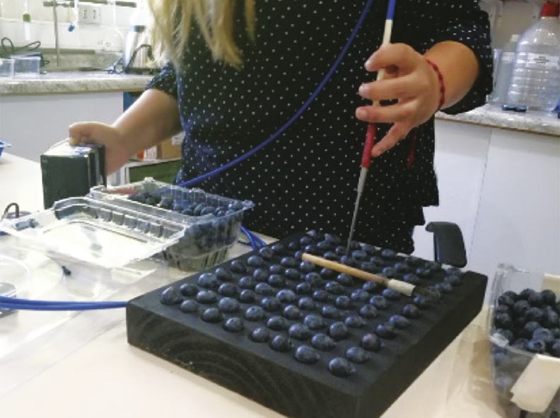 Las decisiones de cuándo cosechar, de destinar los arándanos a mercado fresco o congelado, de aventurarse a un larga travesía de exigente postcosecha, entre otras, dependen en gran parte de la madurez del fruto. Para medirla con seguridad, rapidez, de manera económica, en terreno y sin recurrir al laboratorio, investigadores de INIA en conjunto con Hortifrut desarrollaron una técnica basada en la predicción del contenido de antocianinas a partir de las longitudes de onda que refleja el fruto, según se mostró en el primer Congreso Latinoamericano de Agricultura de Precisión.