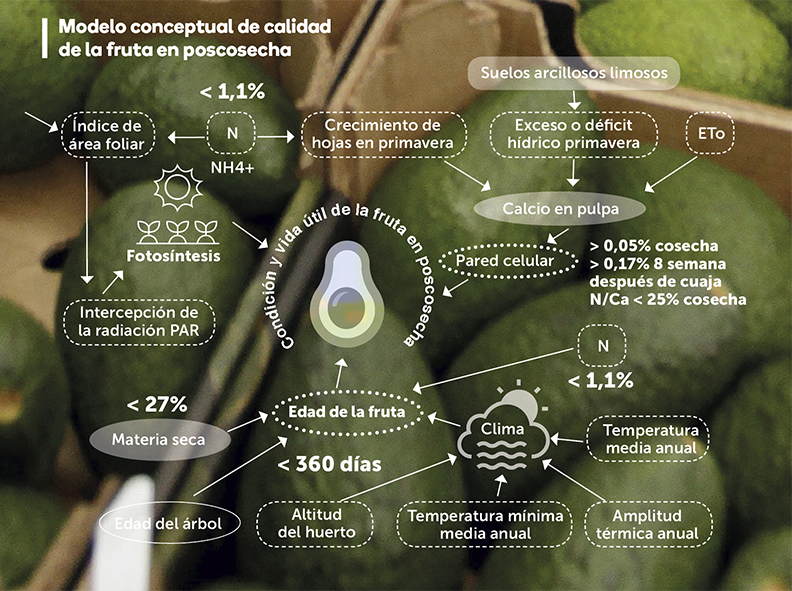 El asesor internacional experto en aguacate y cítricos, ingeniero agrónomo Marco Mattar, realiza sus consultorías en Chile, Perú y Colombia, entre otros países. Pero Mattar apostó por Colombia a la hora de invertir sus propios recursos para producir directamente la fruta. Es así que en este país el asesor participa de la propiedad de dos proyectos productivos de aguacate en el Departamento de Antioquia. Uno en Sonsón (con 80 ha sembradas a 2.500 msnm) y el otro en El Peñol (de 12 ha sembradas a 2.100 msnm). El de El Peñol es un proyecto con árboles de 8 años, en tanto que el de Sonsón es un proyecto nuevo, con árboles de 9 y 12 meses. En base a su experiencia en distintos países y amplio conocimiento agronómico del cultivo del aguacate, el experto nos señala algunas fortalezas y desafíos de la industria colombiana del aguacate. ZONAS PRODUCTIVAS Y RELACIÓN ALTURA SOBRE EL NIVEL DEL MAR Y FECHA DE COSECHA “La relación entre la fecha de cosecha y la altura a la que se cultiva no es tan lineal como se la supone. Por ejemplo, en Sonsón, que está a 2.400 y hasta 2.600 msnm, se pensaba que iba a ser más tardío que la zona de El Peñol (cerca de Medellín), que está entre 1.800 y 2.200 msnm. Pero ha resultado que en Sonsón se cosecha más temprano que en El Peñol”, explica. Como se ha visto, en Colombia se dan dos floraciones, la Principal y la Traviesa, “la principal se puede cosechar, lo más temprano, desde noviembre, pero fundamentalmente desde diciembre hasta febrero. Pero esa floración se adelanta en la zona de Armenia (Quindío), donde se cosecha en octubre, noviembre y diciembre. Pese a que las fincas estén a la misma altura. La Flor Traviesa, por su parte, se cosecha en abril, mayo y junio en Antioquia, meses en que no conviene tener fruta porque está Perú en plena producción. La excepción sería salir en abril, mes en que solo cosecha el norte de Perú, pero nunca en mayo y junio. Sin embargo, en Armenia, zona del Eje Cafetero, eso sí ocurre en marzo y abril, ya que es más tempranera. Es decir, Armenia va un mes adelantado a Antioquia, independiente de la altura. Aunque dentro de un mismo valle, a más altura sí se es más tardío”, señala. -¿Eso indica que se podrían desarrollar manejos para evitar la Traviesa o para moderarla? -En la medida en que logra hacer cuajar más la Flor Principal, se tendrá menos Traviesa. Aunque algo se va a tener de todas maneras. Idealmente se puede llegar a una proporción de 90% de Principal y solo un 10% de Traviesa. La clave está en potenciar al máximo los manejos para cuajar más la Flor Principal, ya que de esa forma se inhibe la siguiente. En nuestro caso, ya llevamos dos campañas con solamente Floración Principal en el huerto de 8 años de El Peñol. En el caso del huerto de Sonsón, con árboles de 9 y 12 meses, la sorpresa ha sido que ya están floreciendo, pero lo malo es que están floreciendo orientados a la Flor Traviesa. Allí la idea es eliminar flores para potenciar la Floración Principal. GRAN VARIABILIDAD DE LA CALIDAD DE LA FRUTA Según Mattar, una de las características del aguacate colombiano es la alta variabilidad de la fruta en cuanto a calidad y condición de llegada a los mercados. “Cuando se abre una caja de aguacates colombianos en destino, se aprecia que hay fruta verde y fruta oscura en la misma caja. Hay mucha desuniformidad del producto. Acá todavía tenemos que trabajar mucho para desarrollar una calidad consistente de la fruta. Como la materia seca de la fruta se relaciona con la humedad del suelo, en países de cultivo bajo riego, existe la práctica de restringir el riego para levantar el porcentaje de materia seca (MS). Sin embargo, la verdad es que ese aguacate no llega bien, porque solo se está deshidratando el fruto, aunque en los análisis aparezca que han subido los niveles de MS. La situación opuesta se da cuando está siempre lloviendo, lo que incide en que no se logre aumentar el porcentaje de MS. Entonces, se debe tener muy claras las fechas de cosecha, porque si esa fruta está fisiológicamente madura, aunque no llegue al rango de MS, esa fruta va a madurar bien. Esos son los dos extremos. Si se cosecha solo mirando el índice de MS es posible cometer graves errores, ya que la pluviometría interfiere ese parámetro”, manifiesta el experto. El otro desafío, pero relacionado, es que -como la floración es larga en Colombia-, en los huertos se encuentra fruta de varias generaciones. En consecuencia, “en un mismo huerto se tiene fruta de 18% de MS y en el árbol de al lado o en el mismo árbol, fruta con 26% de MS. Eso obviamente que influye en la representatividad de la muestra y genera lo que se conoce en poscosecha como “tablero de ajedrez”. Es decir, cajas con fruta de distintos colores y diferentes niveles de madurez”, apunta. Para demostrar de forma muy práctica como afecta a la fruta la demora en entrada a proceso, Mattar describe el siguiente caso. “Tomé una java de 18 kg de aguacates de El Peñol, sin el tratamiento con compuestos clorados que muchas veces se hace para bajar la presión de hongos, y lo transporté todo el día en mi vehículo. El aguacate se cosechó cerca de las 10 am y a las 6 pm puse la mitad de la fruta en la nevera de mi casa y la otra mitad quedó a temperatura ambiente. Esta última tardó aproximadamente dos semanas en madurar y cuando partí esa fruta encontré una gran cantidad de frutos con pulpa gris, desde leve hasta severa. Además, la fruta no estaba homogénea y un lado podía estar blando, en tanto que el lado opuesto de la misma fruta estaba duro. Ante eso lo tradicional sería pensar que tenía graves