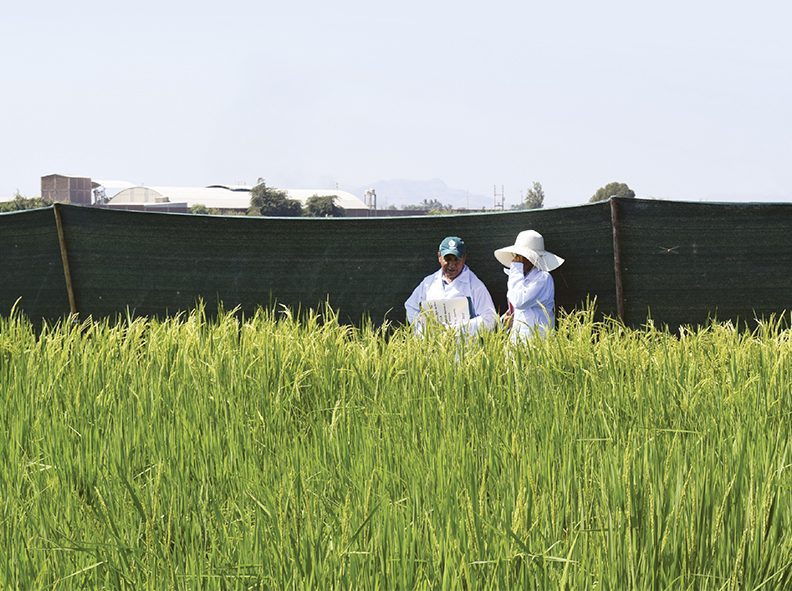 Elizabeth Heros Aguilar, Coordinadora General del Proyecto. lizheros@lamolina.edu.pe El cambio climático, afecta a la agricultura en varias formas: • Disminuyendo la productividad en cantidad y calidad • Cambiando prácticas agronómicas, como modificar el uso del agua de riego, el uso de fertilizantes, pesticidas y herbicidas • Efecto ambiental en relación a la erosión de los suelos, salinización, contaminación del acuífero y reducción de la diversidad agrícola. • Adaptación: Se desarrollarán organismos más competentes como cultivares más tolerantes a las sequías, inundaciones, y salinidad. El cambio climático antropogénico, ocasionado por la deforestación, fábricas, medios de transporte, (producen CO2) y metano producido por las granjas ganaderas extensivas y campos de arroz se pueden controlar y bajar las emisiones. El aumento del CO2, favorecería la producción de arroz, pero la elevación de la temperatura nocturna consumiría más energía reduciendo los rendimientos. Se estima que en el centro y sur de Japón, los rendimientos bajarían en 40% a fines del siglo XXI. Por el calentamiento de la superficie de los océanos, se producirían lluvias fuertes, causando inundaciones en muchas regiones. Asimismo, las sequías se incrementarían por mayor temperatura y mayor evaporación, las precipitaciones cambiarían en frecuencia, intensidad y distribución afectando las épocas de siembra en las áreas de secano. La mayor producción de arroz se obtiene de las áreas irrigadas, que aportan el 75 % de la producción mundial de arroz cáscara, equivalente a 530 millones de toneladas de un total de 703,840 millones de TM de arroz cáscara (FAO, 2017). El consumo de agua en este sistema se estima hasta en 25,000 m3ha-1, es decir este sistema requiere grandes volúmenes de agua por ha-1. 25 MILLONES DE HECTÁREAS DAÑADAS POR LA SEQUÍA EN 2025 En el Asia se estima que más de 25 millones de hectáreas tendrían daños por sequía en diferentes grados en 2025. Varias tecnologías de ahorro de agua se han desarrollado en los últimos 35 años para mejorar la eficiencia de uso, con resultados variables en los diferentes sistemas de producción de arroz. La variabilidad de los suelos en textura, características nutricionales y gradientes, evaporación, profundidad de la napa freática, como tipo de pH han originado respuestas poco exitosas en las tecnologías de ahorro de agua. El desarrollo de los sistemas aeróbicos, con cultivares aeróbicos, desarrollados para estos sistemas, permiten el cultivo de arroz con manejo de riego similares a maíz o trigo. En varios lugares de China se practica este sistema de producción con éxito. Este sistema sería el más promisorio en las próximas décadas, para mejorar el uso del agua, en las regiones con escasez. En las siembras por inundación del cultivo de arroz, se produce grandes emisiones de metano, que contribuyen al calentamiento global. Grandes esfuerzos a nivel internacional se están realizando para reducir estas emisiones, existiendo consorcios y plataformas de investigación, integradas por varios países. En el Perú el sistema de siembra más generalizado es por trasplante, con riegos de inundación durante todo el cultivo. Los volúmenes asignados por ha-1 varían de 12,000 a 20,000 m3ha-1, en los valles arroceros de la costa y selva alta. En selva baja el manejo es con agua de lluvia, en siembra directa así como en los barriales (playa de los ríos amazónicos). MEJORAS EN TECNOLOGÍA, COSECHA Y PROCESAMIENTO El Perú es el segundo país productor de arroz con más de tres millones de t de arroz cáscara, después del Brasil, y el segundo país en rendimiento con 7,6 t ha-1, después de Uruguay en América Latina. Las posibilidades para aumentar la producción son altas, mejorando las tecnologías de producción, cosecha y procesamiento. En el año 2016, se produjeron 3,147,200 tonelada de arroz, con un crecimiento de 0.6% con relación del 2015. En quince años (2001-2015), la producción de arroz creció en 3.1%, por incremento de área (2%) y por mayor rendimiento (1.1%). Los mayores rendimientos por hectárea se obtienen en las áreas arroceras de la costa y selva alta (13-8 t ha-1) y los menores rendimientos en la selva baja (2 t ha-1), por influencia de suelos ácidos y presencia de insectos y enfermedades. El arroz en el Perú es un cultivo de gran importancia socio económica, da ocupación a más de 120,000 familias y representó en el 2015, el 8,1% del valor bruto de la producción agropecuaria y el 13,1% del valor bruto de la producción agrícola. Las regiones de mayor rendimiento en el 2015 fueron: Arequipa con 13 t ha-1 en la costa sur y Ancash y La Libertad en la costa norte con 11,8 y 10,6 t ha-1. A nivel de campo, se observa un cambio gradual del sistema de siembra al trasplante por siembra directa en seco en la costa y en pozas al batido en selva alta. Este cambio se origina por la gran cantidad de mano de obra que requiere el trasplante, que en los periodos de alta demanda, es escaza y de alto costo, porque el arroz compite con los productos de exportación que realizan cosecha manual, bajando la rentabilidad del cultivo. El incremento de las presiones bióticas por el cambio climático, inducen a los agricultores a realizar aplicaciones frecuentes de pesticidas, aumentando los costos de producción y contaminando el ambiente. El alto consumo de agua, emisiones de metano y el efecto ambiental por el uso excesivo de agroquímicos, indican que los sistemas de producción de arroz no son sustentables ni tienen adaptación al cambio climático. EFICIENCIA EN EL USO DE AGUA Y NUTRIENTES El proyecto de investigación del Programa de Investigación y Proyección Social en Cereales y Granos Nativos de la Universidad Nacional Agraria La Molina tiene como objetivo mejorar la sustentabilidad del cultivo de arroz, desarrollando innovaciones tecnológicas que eleven la eficiencia de uso del agua y de lo