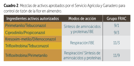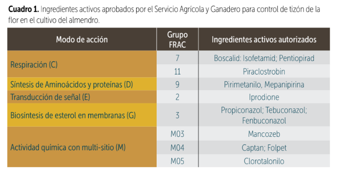 Los fungicidas para el control de estas enfermedades deben tener doble acción, tanto contra Monilia spp. como Botrytis cinerea. Los activos de síntesis química disponibles en el mercado chileno, aprobados por el Servicio Agrícola y Ganadero se detallan en el cuadro 1.