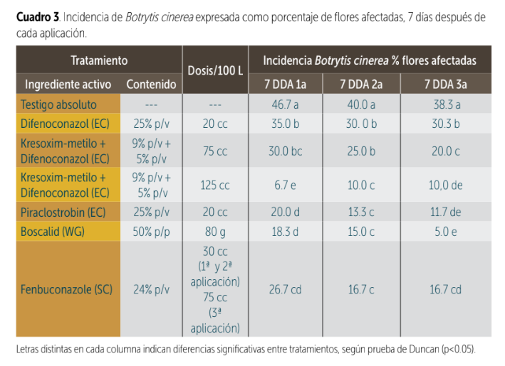 Considerando las alternativas disponibles en el mercado, al momento de diseñar un programa de aplicaciones, es importante posicionar el producto más efectivo en el momento más sensible al ataque del patógeno, que es la plena flor.