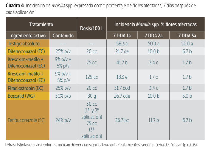 Se llevaron a cabo evaluaciones parciales 7 días después de cada aplicación (DDA), cuyos resultados se exponen en los cuadros 3 y 4. Estos cuadros muestran el porcentaje de flores afectadas por Botrytis cinerea y Monilia spp., patógenos causantes del tizón de la flor del almendro (foto 2).