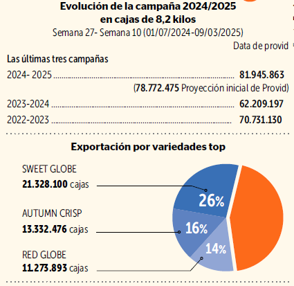 Números impresionantes de la campaña 2024/25. Sin embargo, el precio promedio de la fruta ha sido, al cierre de esta edición, un 5% menor. No es todo, ya que, según especialistas, ha habido algunos problemas de condición y calidad en los arribos que son necesarios superar si es que se quiere seguir siendo competitivos.