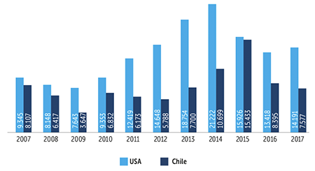 Como ya se mencionó, además del frío es necesaria la acumulación de calor, por lo que el mapa de la acumulación de calor en DGC nos puede servir para identificar zonas tempranas de producción, como se aprecia en la Imagen 2C, que muestra la estimación de la acumulación de DGC de septiembre a diciembre. En zonas tempranas con una rápida acumulación de calor tienen rangos que van entre 700 a sobre 800 DGC a diciembre, aquí las variedades Royal Dawn, Santina y Lapins tienen fechas de cosecha a inicios, mediados y fines de noviembre respectivamente. Mientras que, en zonas con una menor tasa de acumulación de calor, donde se registran valores de DGC entre 500 a 600 o inferiores, se cosechan estas mismas variedades hasta una semana después, pero es necesario considerar que puede haber un efecto de manejo asociado a la aplicación de rompedores de dormancia (datos recolectados por el equipo SAIA de productores asociados y por el asesor Walter Masman).